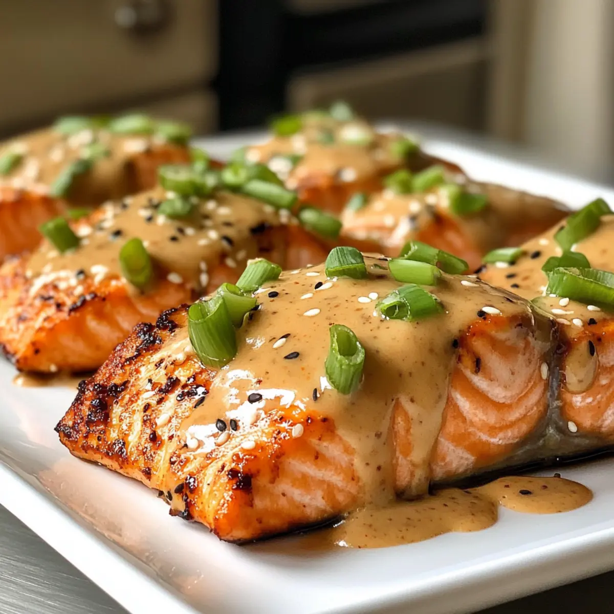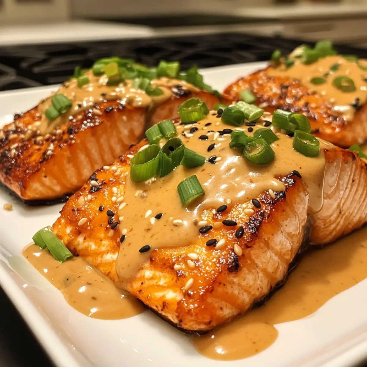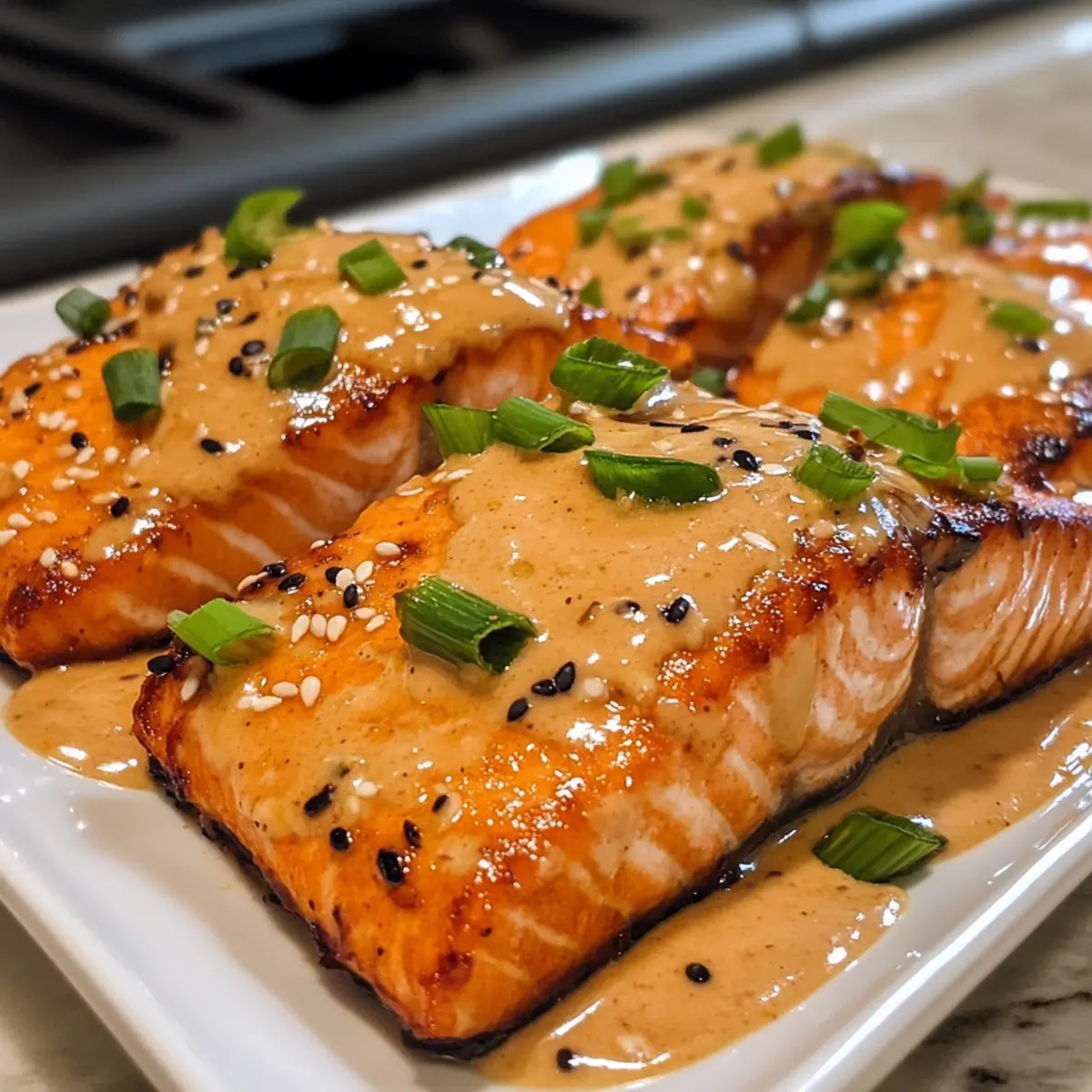 - Remove the salmon from the oven, drizzle with Bang Bang sauce, and garnish with chopped green onions and sesame seeds.