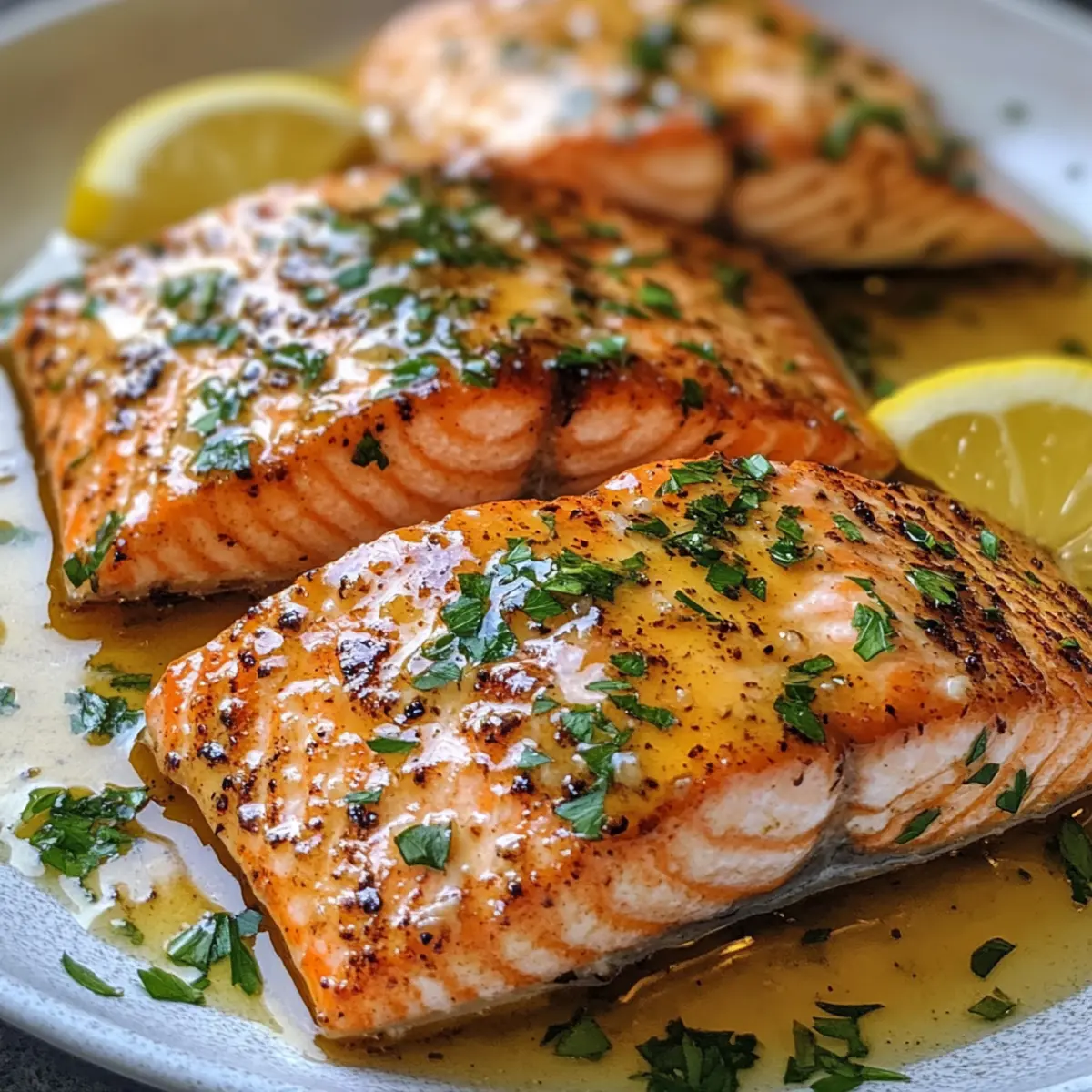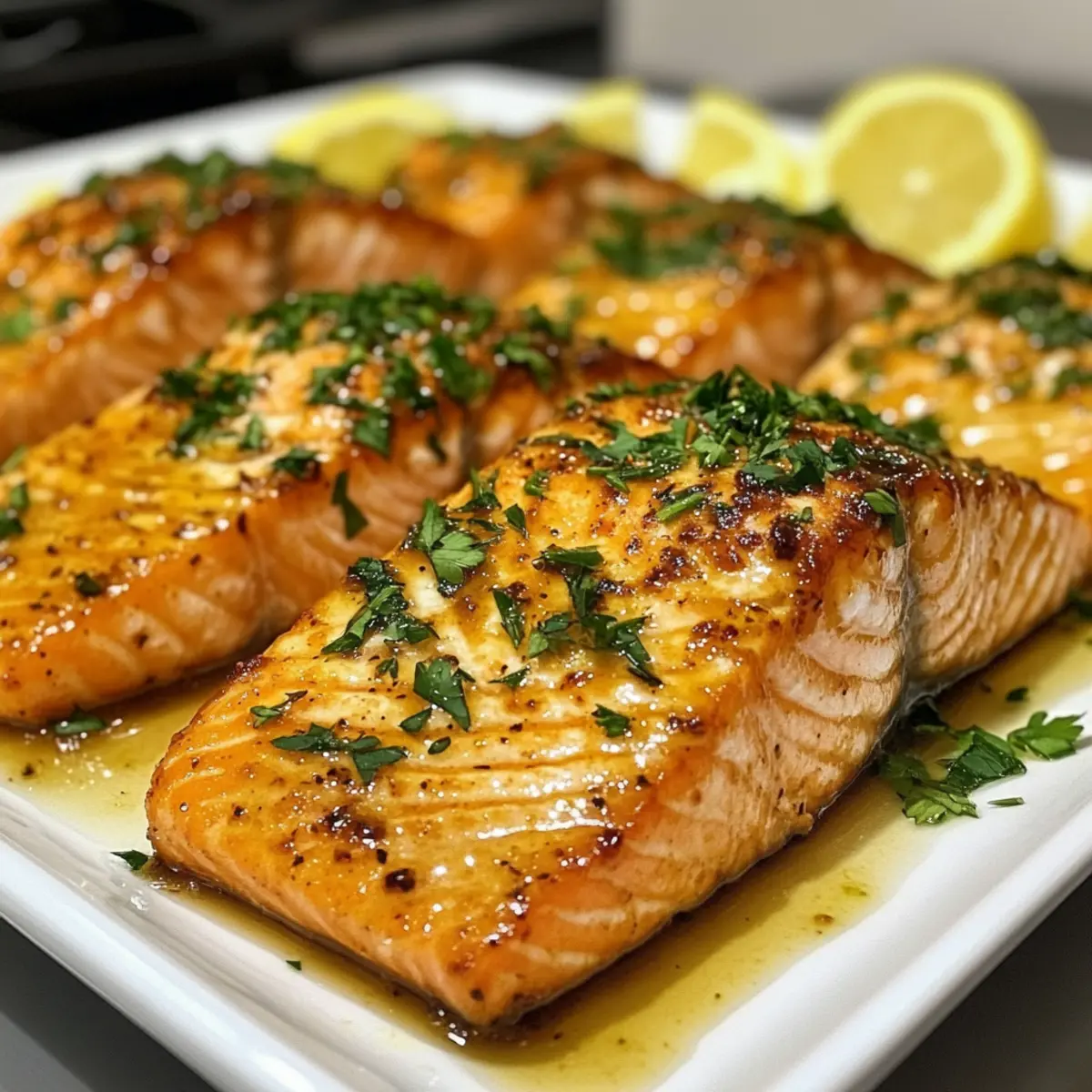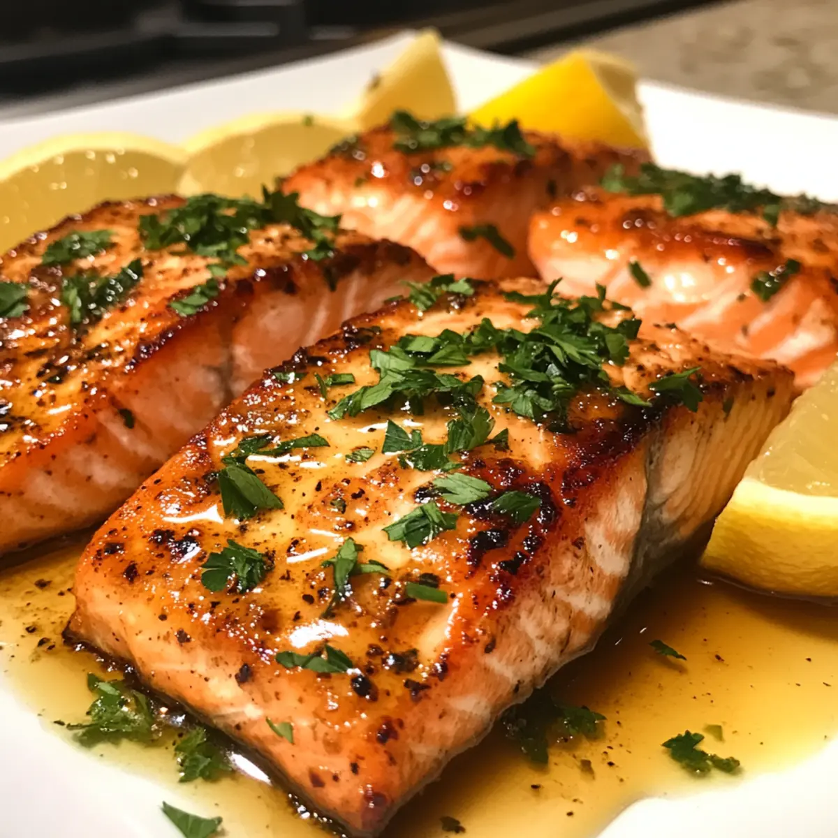 Once the salmon is fully cooked and glistening with the honey butter glaze, remove the skillet from heat. Garnish each fillet with freshly chopped parsley for a pop of color, and serve immediately with lemon wedges on the side. For an extra touch, sprinkle with black sesame seeds for added texture and visual appeal.