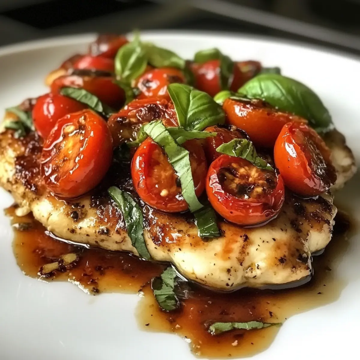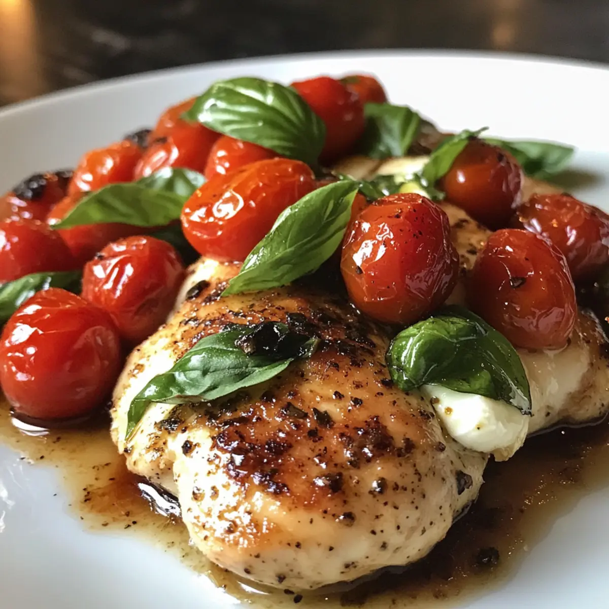 - Once the chicken is cooked through, remove the skillet from heat. Spoon the marinated tomato mixture evenly over the chicken cutlets, making sure to scatter the tomatoes generously. Top each cutlet with slices of fresh mozzarella, allowing the creamy cheese to nestle perfectly atop the flavorful tomatoes.