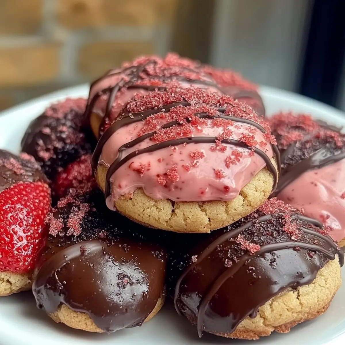 These Chocolate Covered Strawberry Cookies are perfect for busy cooks looking to save time without sacrificing quality! You can prepare the cookie dough up to 24 hours in advance and refrigerate it, ensuring it remains fresh. Simply scoop the dough into balls, cover them tightly, and chill. This will enhance the flavors and allow for an even better texture. When ready to bake, just take them out, let them sit at room temperature for about 10-15 minutes to soften slightly, then roll and flatten before baking. After baking, drizzle the melted chocolate on top, and allow it to set before serving. Enjoy these delicious treats without the last-minute rush!