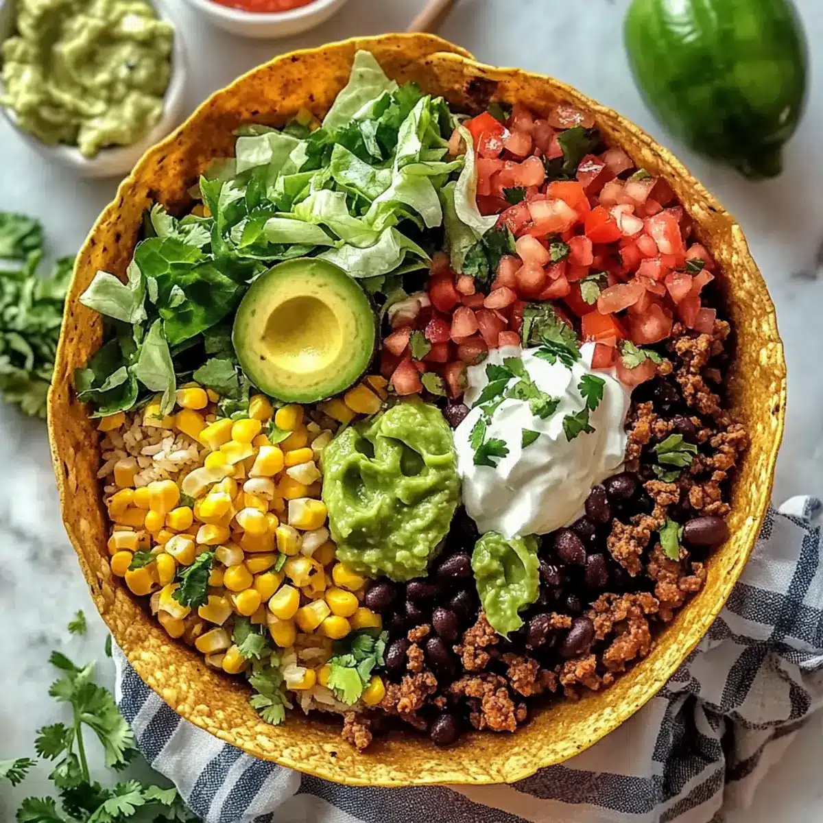 - Assemble tacos by layering rice in each tortilla bowl, followed by beef filling, charred corn, and black beans. Top with fresh toppings like lettuce, guacamole, pico de gallo, sour cream, and a squeeze of lime juice.