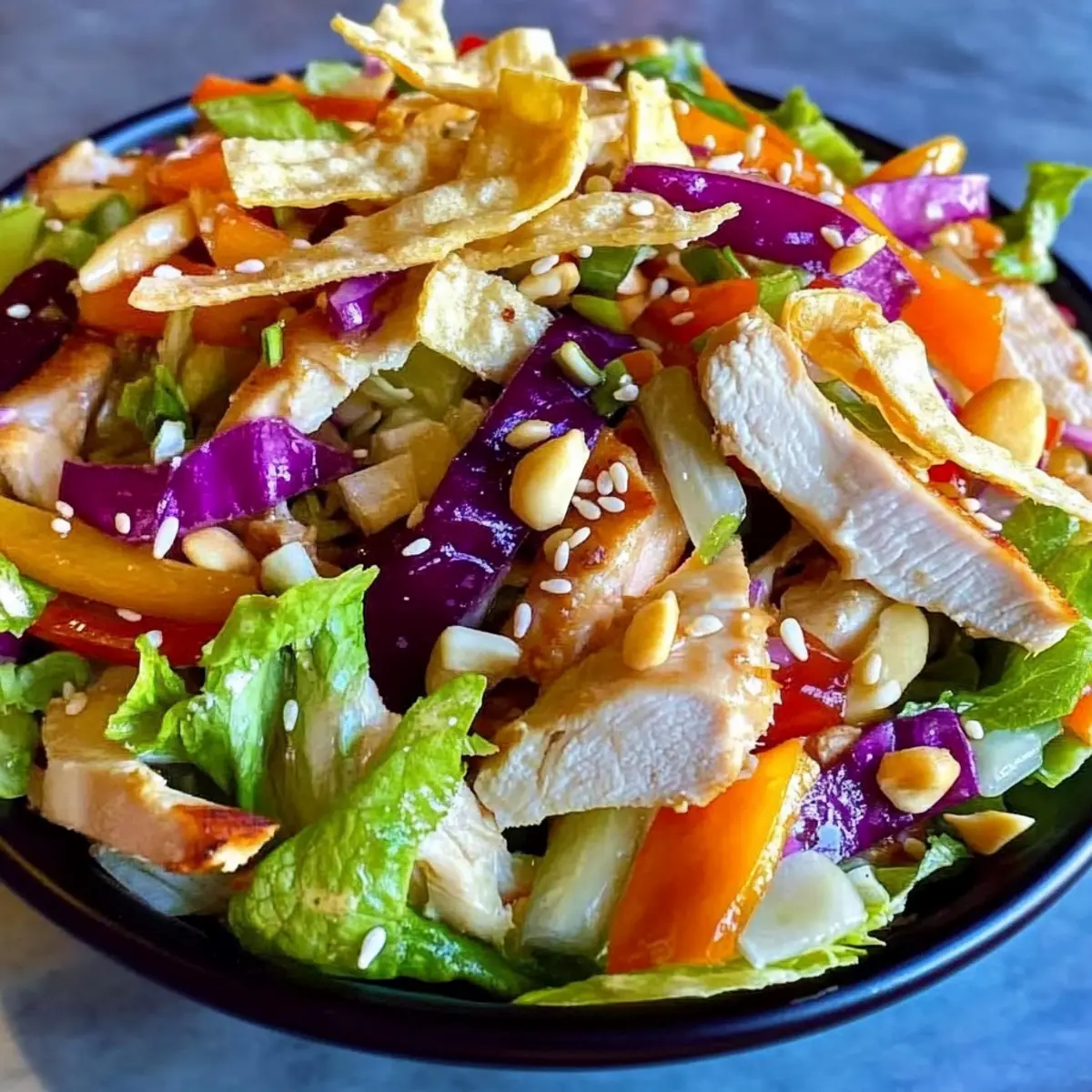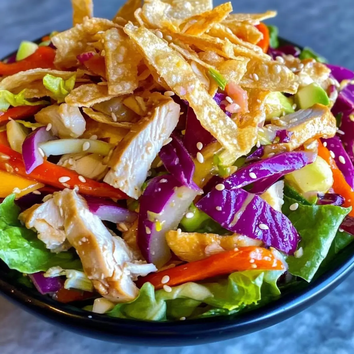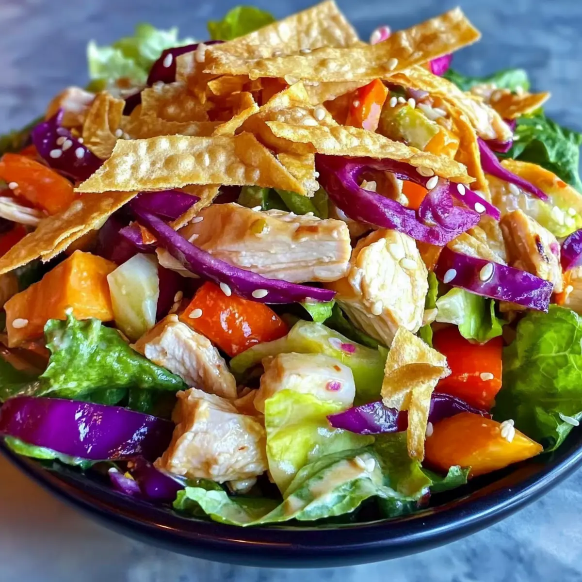 To keep the wonton strips crisp, serve the salad immediately after dressing. Present it in a large serving bowl or plated individually, garnished with additional sesame seeds if desired. This ensures that the salad remains a crunchy, flavorful experience that everyone will love, making it the perfect healthy meal option.