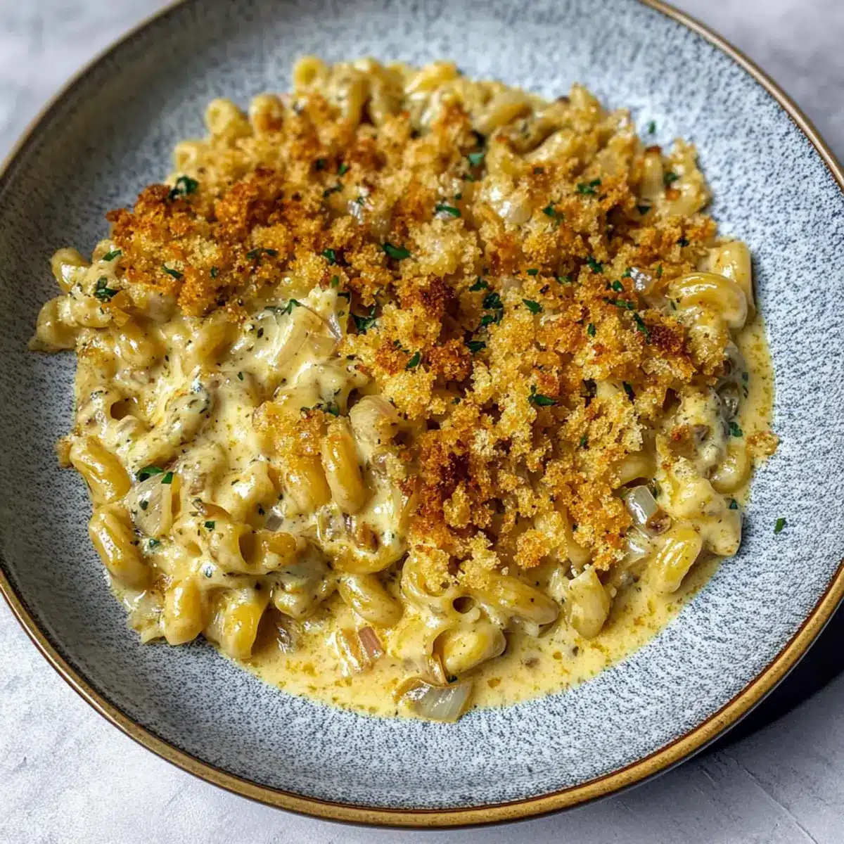 • Crispy Topping: For extra crunch, mix in some grated cheese with your breadcrumbs before baking. It enhances flavor and adds a golden finish to your French onion soup pasta.