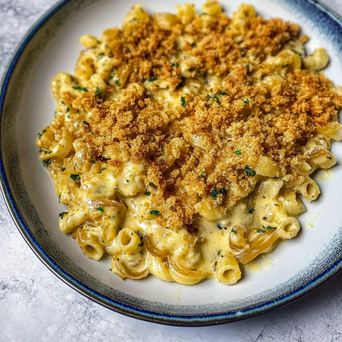 Preheat your oven to 350°F (175°C). Transfer the pasta mixture into a greased baking dish and spread it out evenly. Top with the remaining caramelized onions and a handful of homemade breadcrumbs. Bake in the preheated oven for 10-15 minutes or until the top is golden and crispy, creating an inviting texture that contrasts with the creamy pasta underneath.