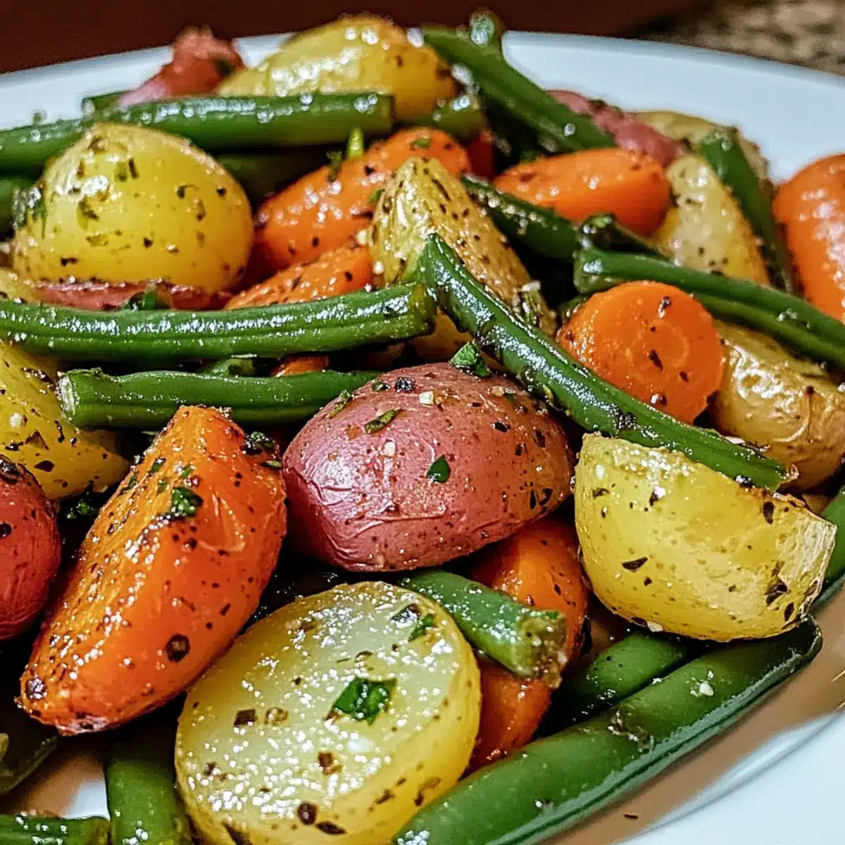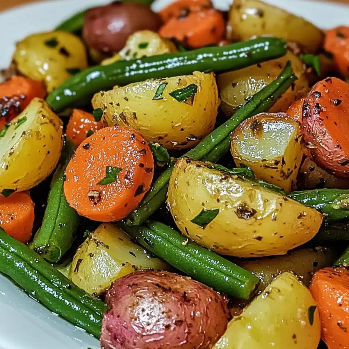 Ever found yourself in a pinch, needing a quick yet satisfying side dish that everyone will love? Enter my Garlic Herb Roasted Veggies! This delightful dish is a game-changer for busy weeknights, featuring tender baby potatoes, vibrant carrots, and crisp green beans, all perfectly roasted with aromatic garlic and a sprinkle of herbs. Not only is this recipe a breeze to whip up, but it’s also vegan and gluten-free, making it suitable for various dietary needs. Whether you’re pairing it with a roast or enjoying it as part of a hearty meal prep, these veggies add that pop of color and flavor to your table. Curious about how to customize it to fit your taste? Let’s dive in!