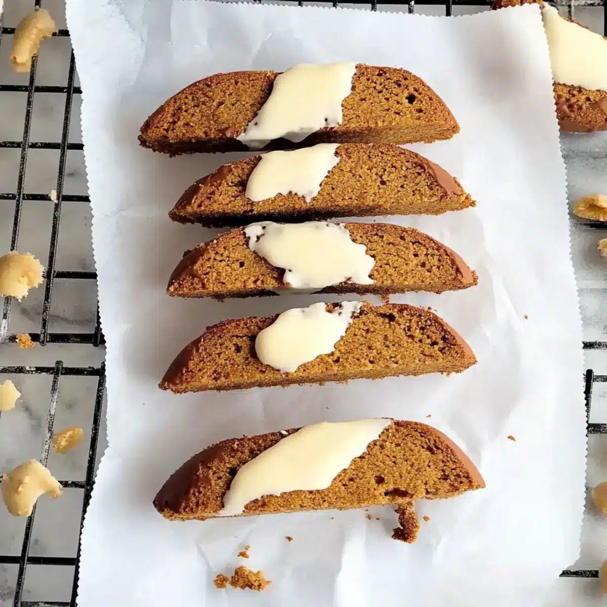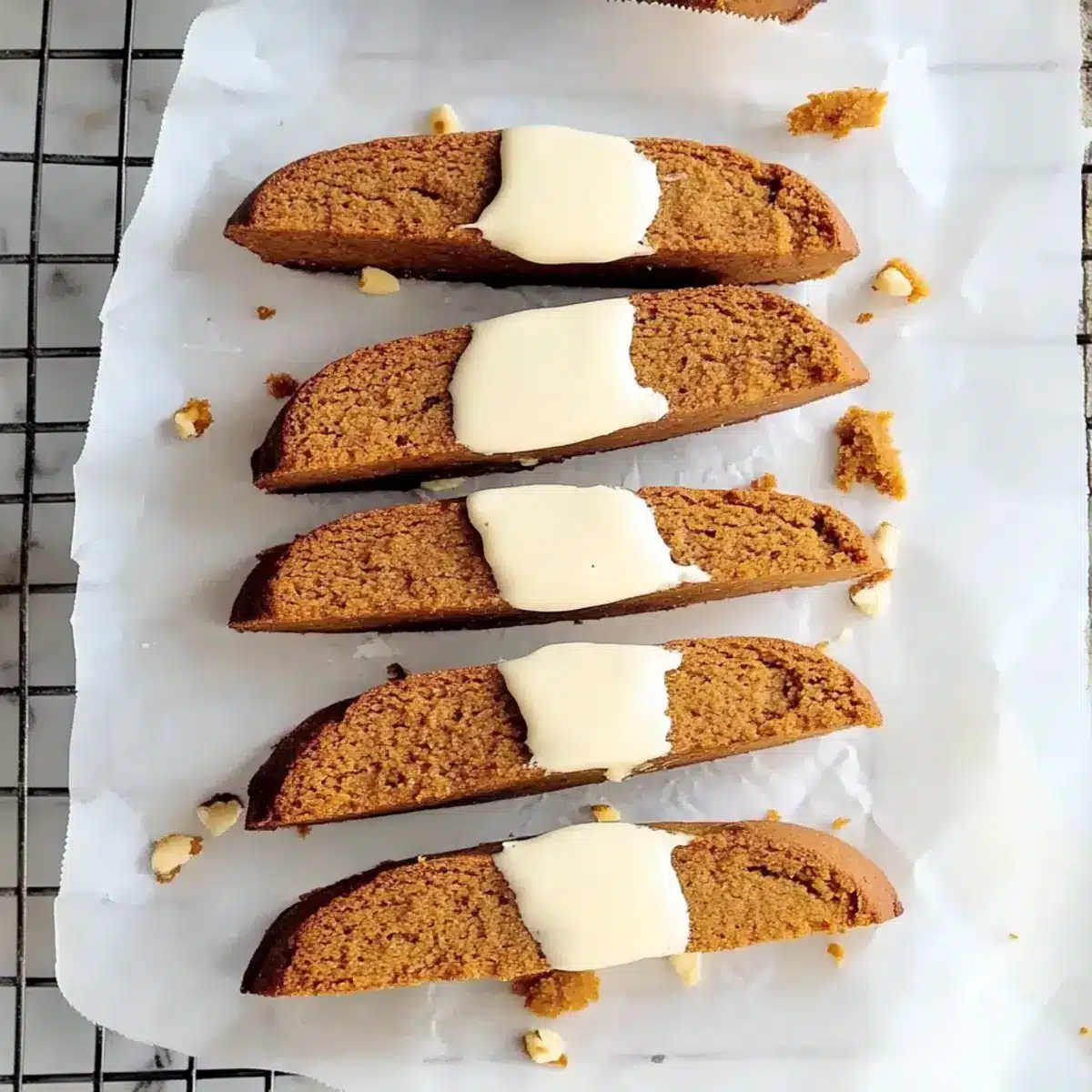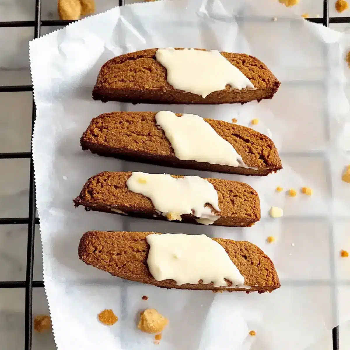 If you desire to elevate your creation, melt white chocolate in a microwave or a double boiler. Dip one end of each biscotti into the melted chocolate, letting the excess drip off before placing them on parchment paper to set. This optional step adds a festive flair and richness, perfectly complementing the spiced gingerbread flavor.