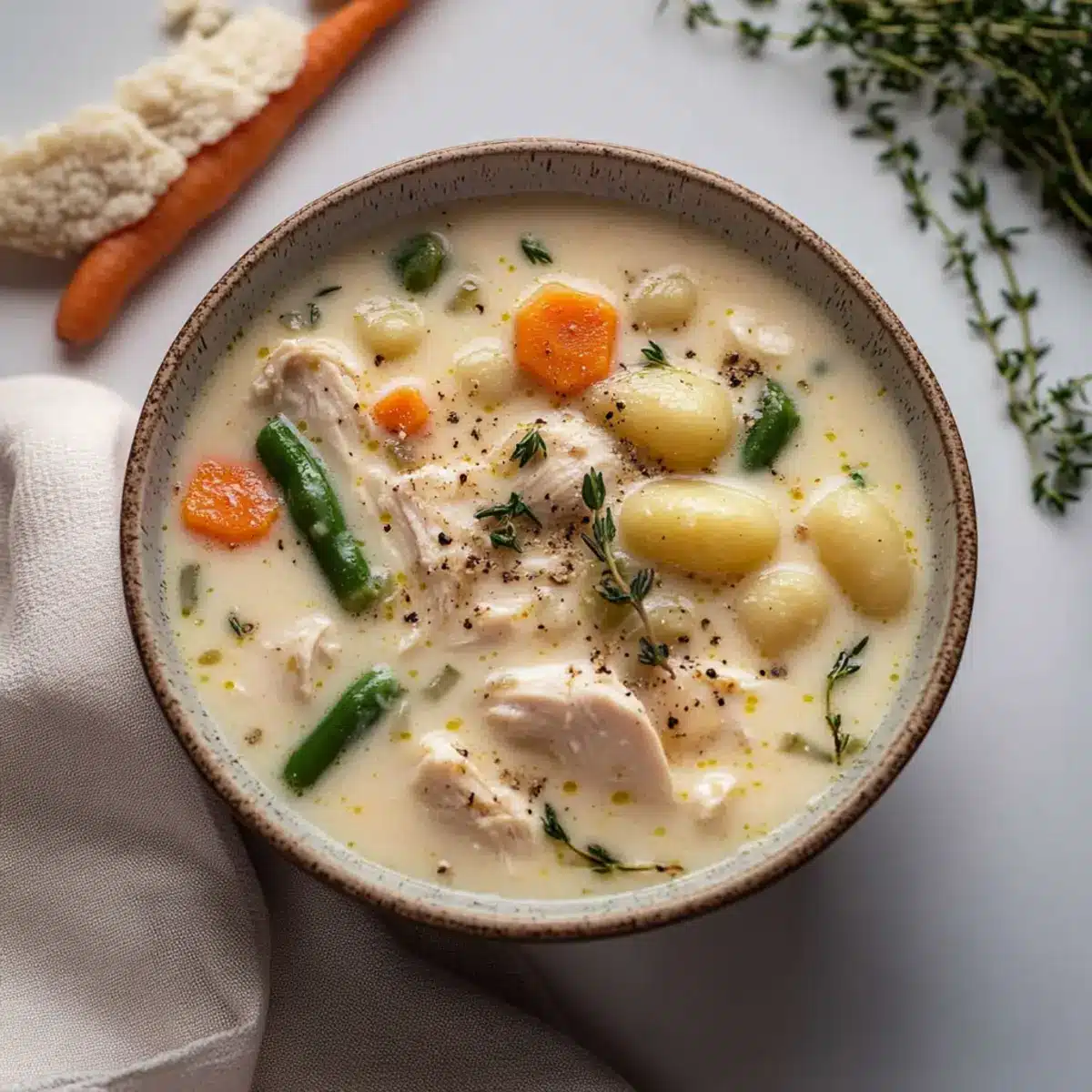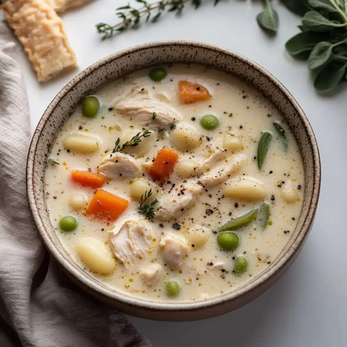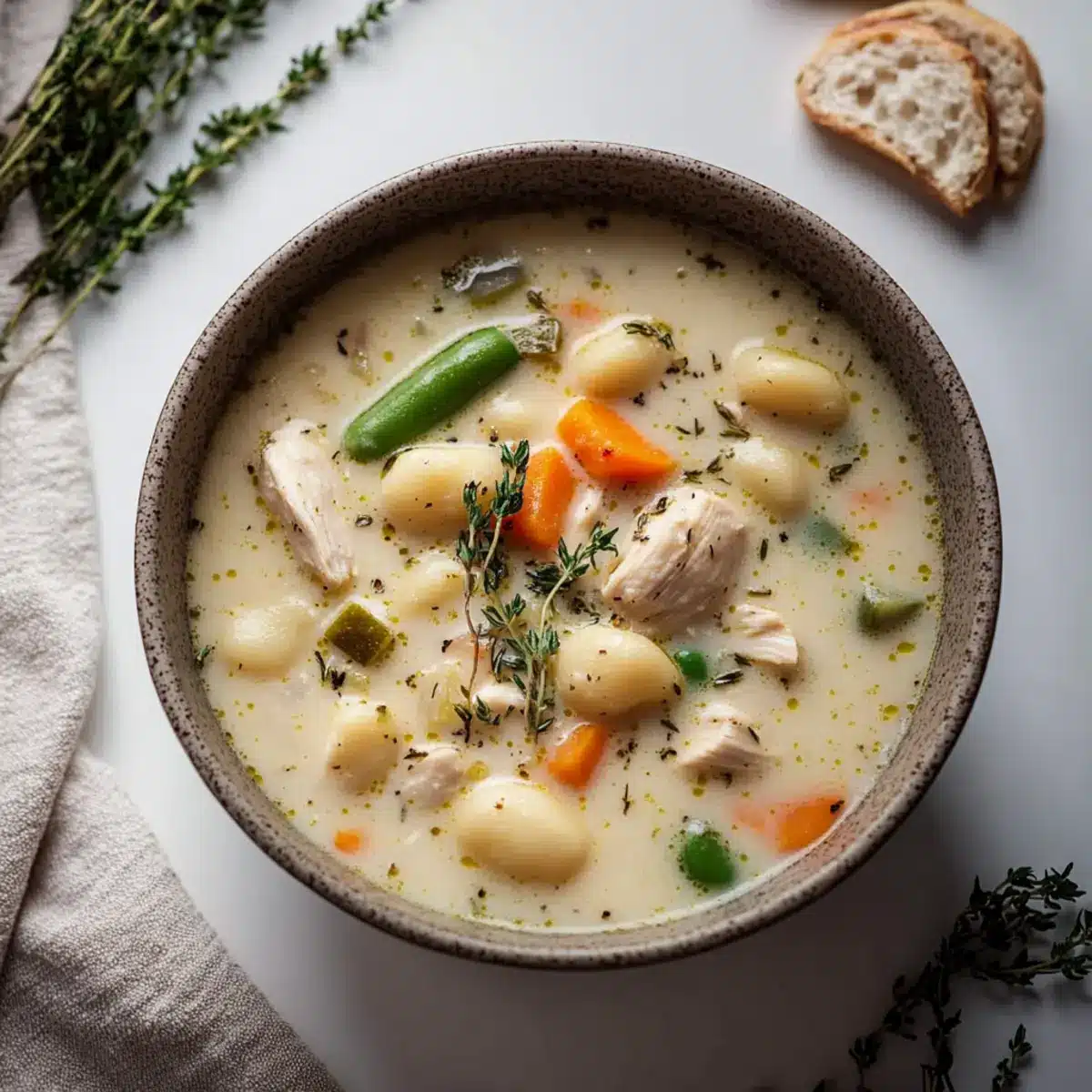 Ladle your hearty Gnocchi Chicken Pot Pie soup into bowls, garnishing with fresh thyme and a sprinkle of cracked black pepper. Pair it with warm, crusty bread for dipping, and savor the comforting warmth as you enjoy this delicious twist on a classic dish.