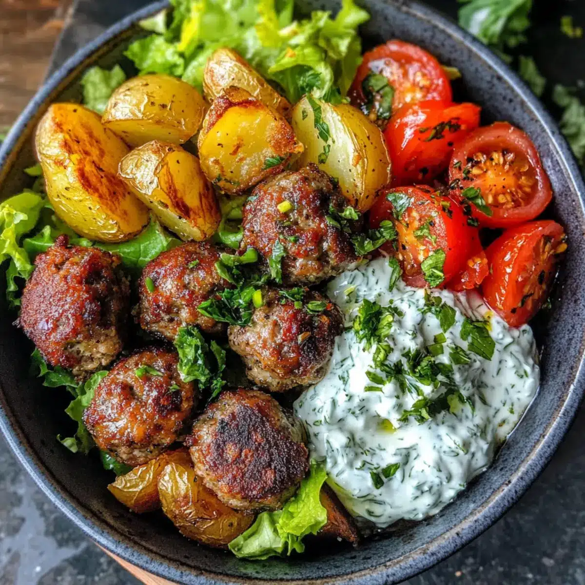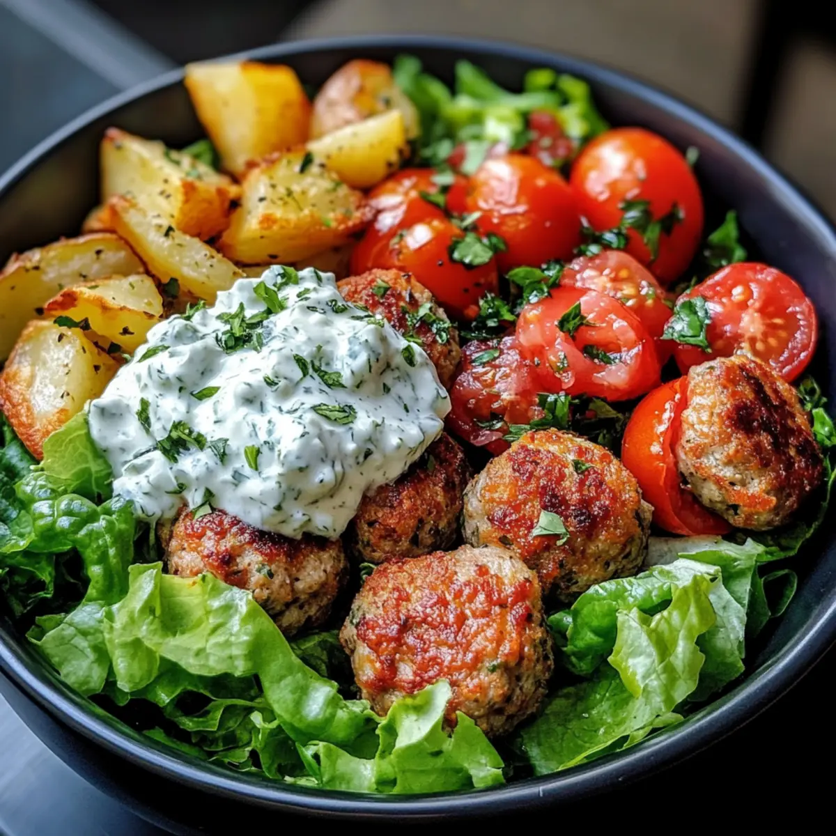 - Assemble the bowl with layers of lettuce, tomatoes, cucumbers, red onions, olives, roasted potatoes, and meatballs, topped with tzatziki sauce.