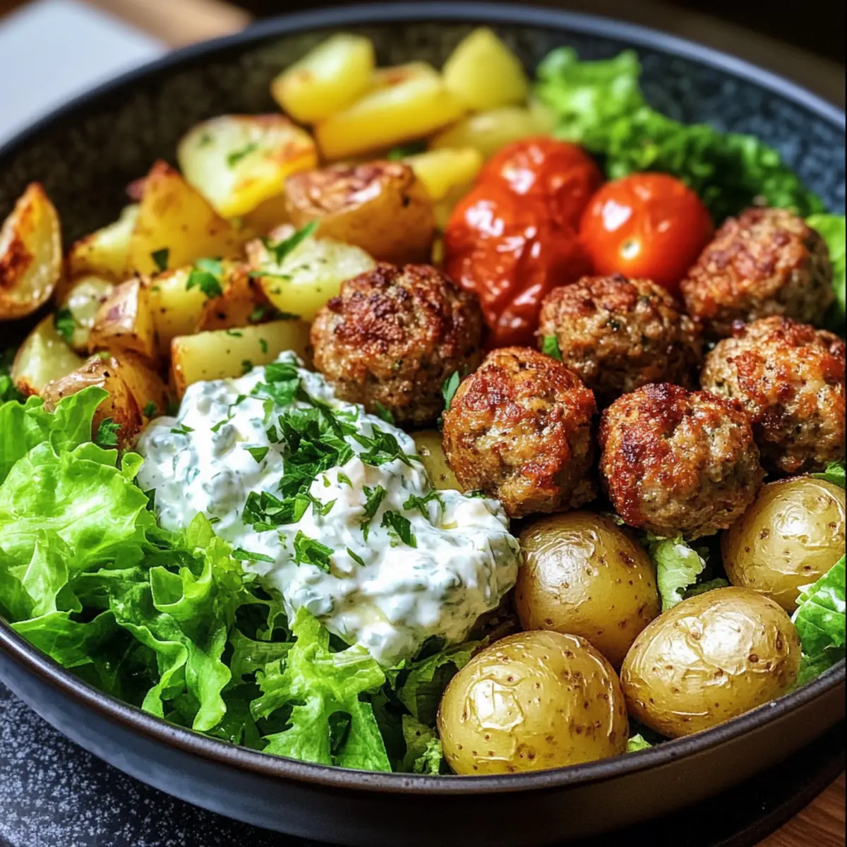 Layer Ingredients: For a beautifully presented bowl, layer your salad ingredients first, followed by roasted potatoes and meatballs. This adds visual appeal and flavor balance.
