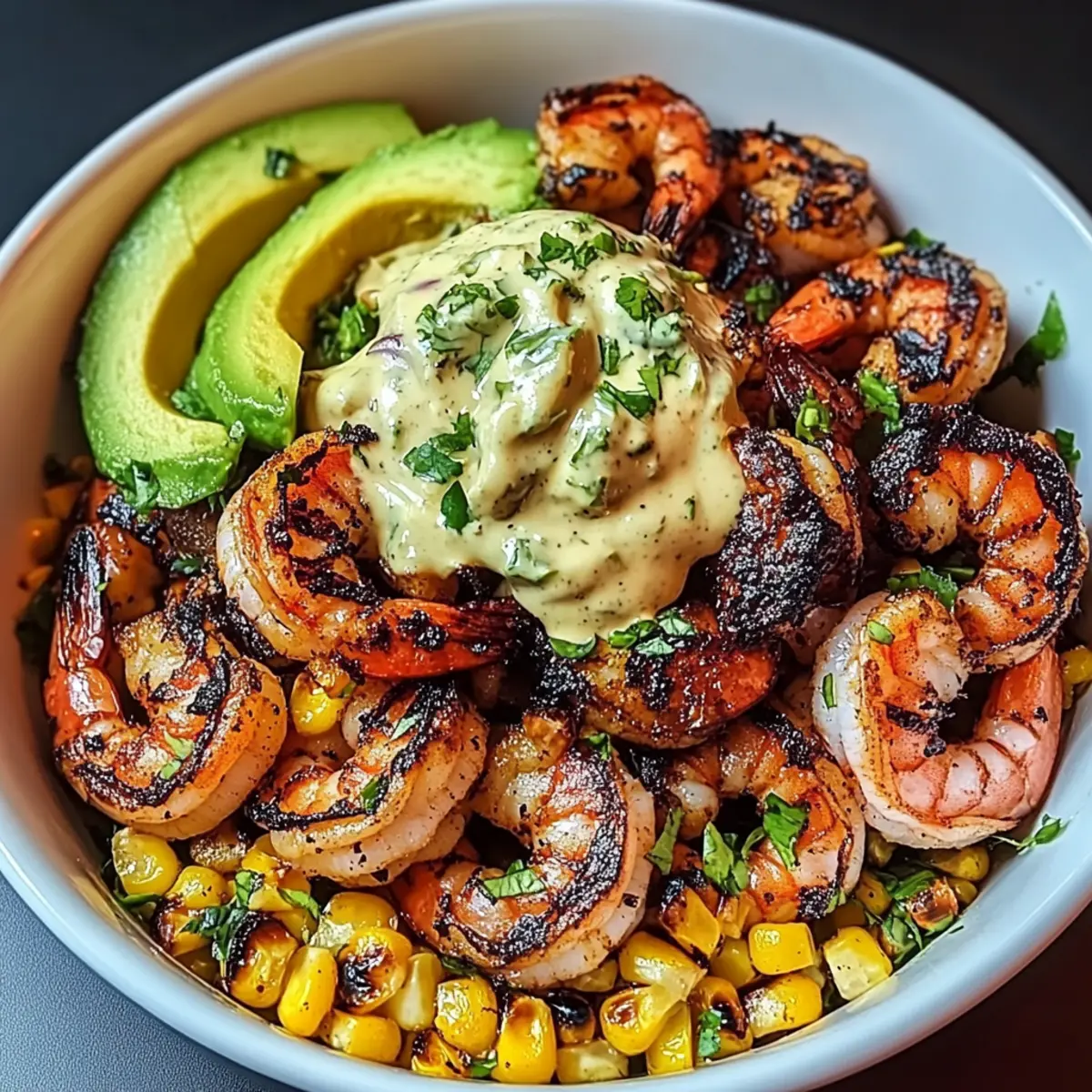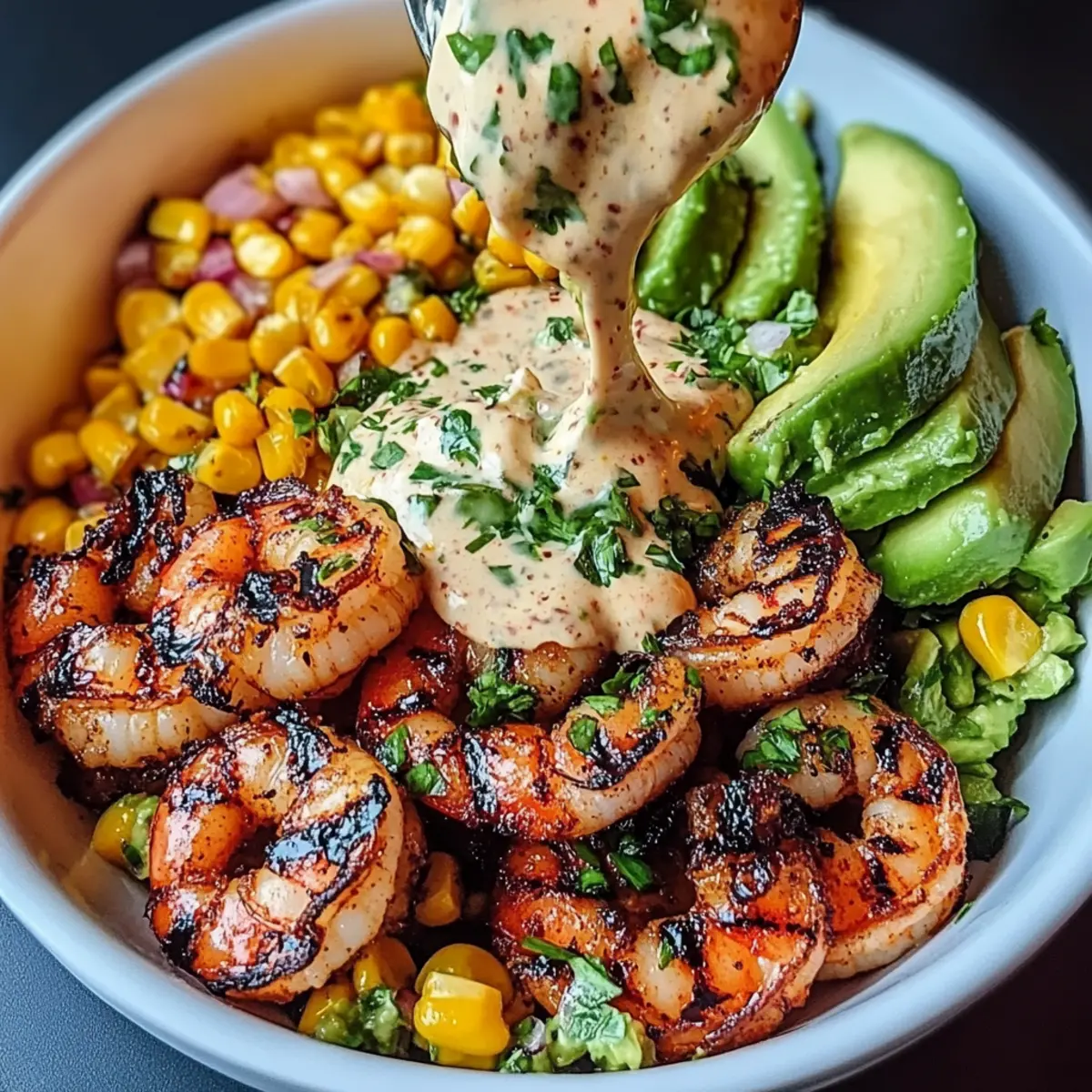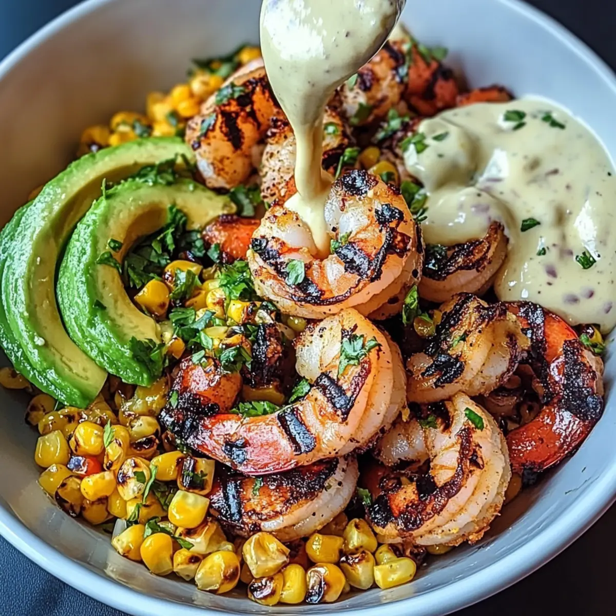 Grilled Shrimp Bowl with Avocado, Corn Salsa & Creamy Garlic Sauce Delight