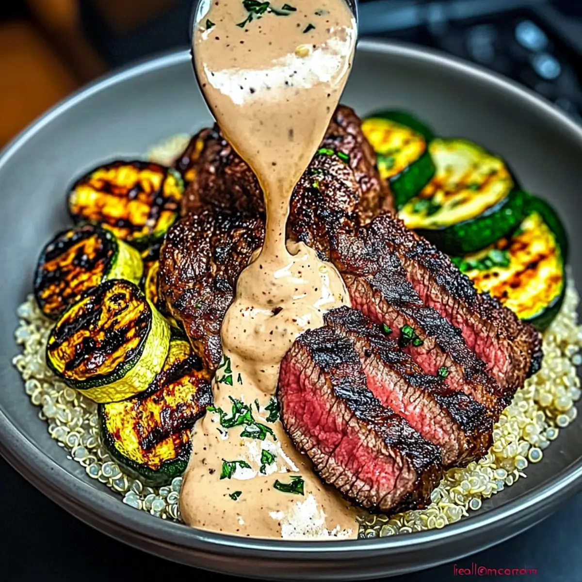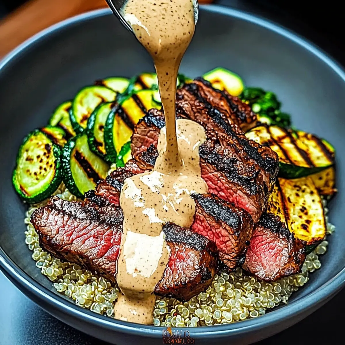 To create your masterpiece, start by layering the base of cooked grains in each bowl. Next, add the grilled zucchini slices and top with generously sliced steak. Drizzle the creamy sauce over the steak and zucchini, and garnish with freshly chopped parsley or chives for a pop of color and freshness.