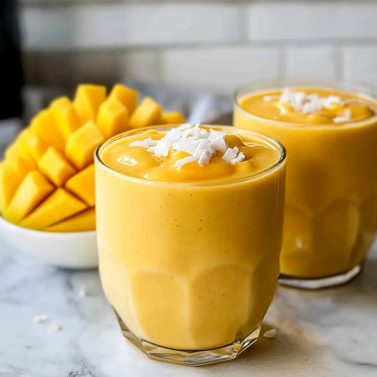 - Pour into glasses and garnish with sliced mango or shredded coconut, then serve immediately.