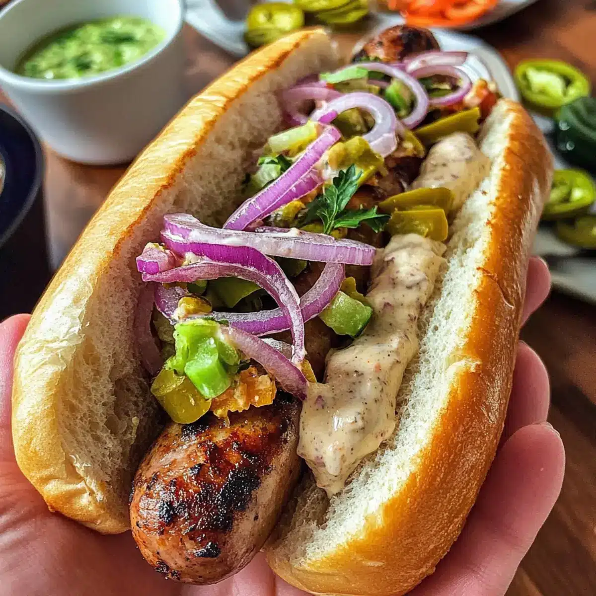 - Spread remoulade sauce on the toasted roll sides, place a cooked sausage half, top with crumbled chorizo, and sprinkle with red onions, green onions, and peperoncini slices.