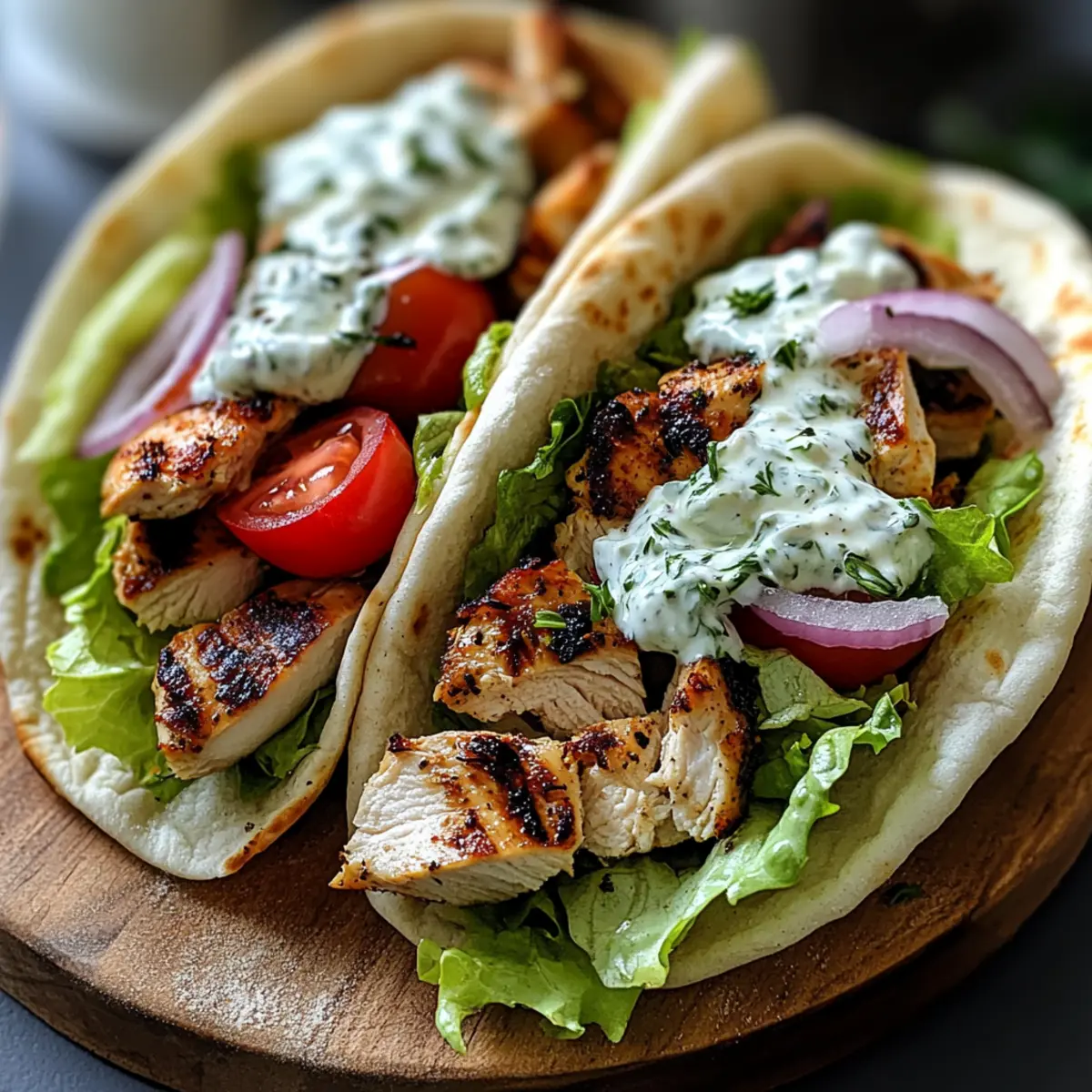 - Assemble gyros by layering sliced chicken, cherry tomatoes, red onion, and greens on the pita. Drizzle with tzatziki.