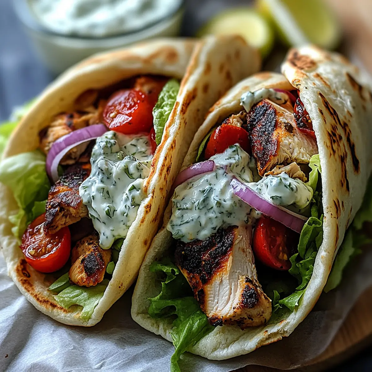 Now it’s time to assemble your Mediterranean Chicken Gyros! Take your warmed pita and layer it generously with sliced chicken, fresh cherry tomatoes, crisp red onion, and greens like lettuce or spinach. Drizzle a good amount of the creamy feta tzatziki on top to finish off this delicious creation.