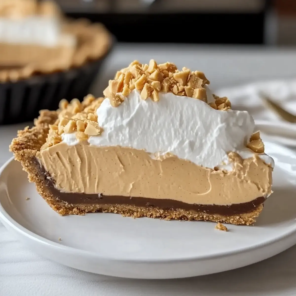 - Remove from refrigerator, slice into wedges, and garnish with additional whipped topping and crushed peanuts if desired.