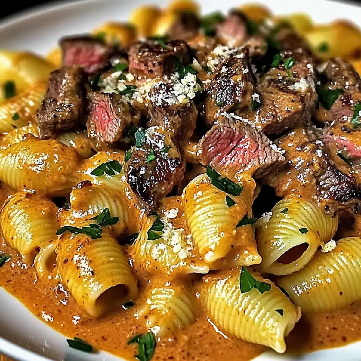 Next, stir in the remaining paprika and grated Parmesan cheese, blending until the sauce is smooth and creamy. Cut the rested steak into bite-sized pieces and return it to the skillet along with the drained pasta shells. Toss everything together to ensure each shell is generously coated with the creamy paprika sauce, letting the flavors meld for an additional minute.