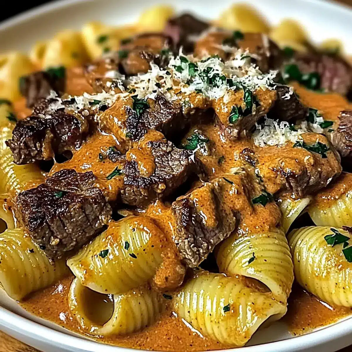Once fully combined and warmed through, taste and adjust seasoning with salt and pepper as needed. Serve the creamy paprika steak and shells warm, garnished with freshly chopped parsley and extra Parmesan cheese if desired, making for a delightful and comforting dinner.