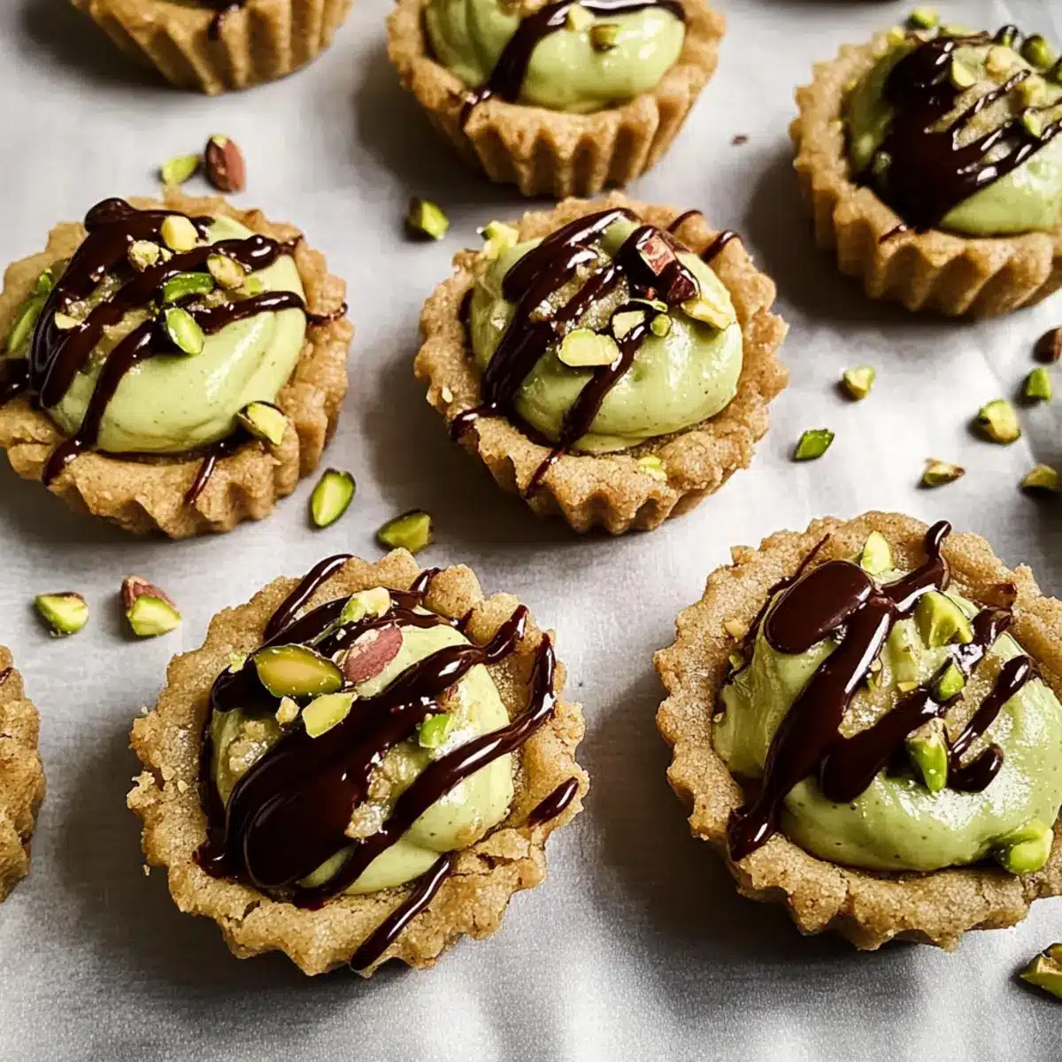 - Melt the dark chocolate and drizzle over each filled cookie cup, sprinkling extra pistachios on top.