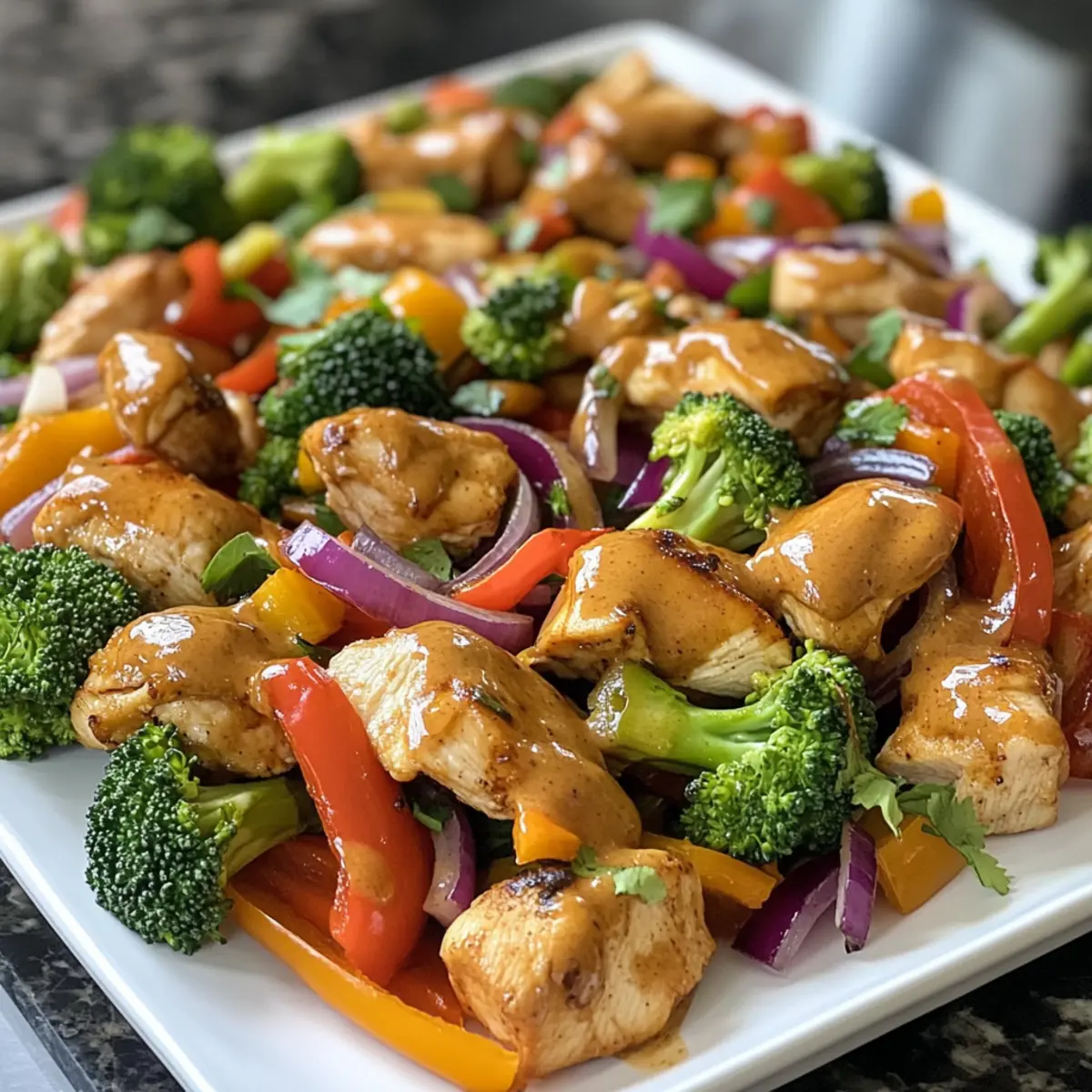 Remove the baking sheet from the oven and drizzle the chilled peanut sauce generously over the chicken and vegetables. Garnish with sliced green onions, chopped cilantro, and a sprinkle of sesame seeds before serving. Pair with warm jasmine rice or rice noodles for a complete meal!