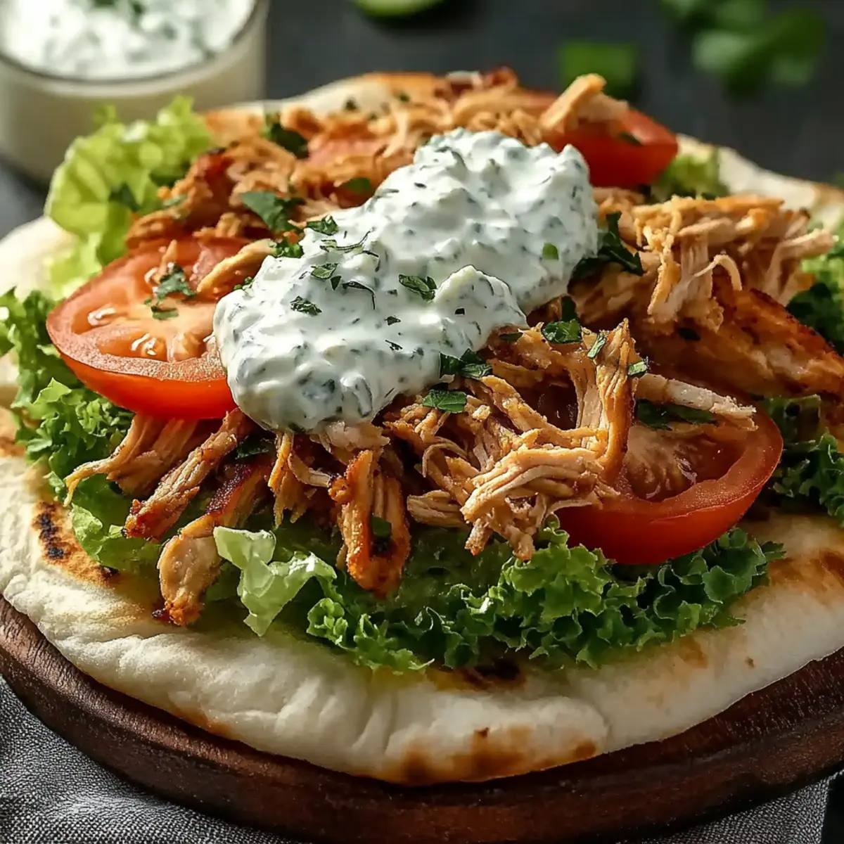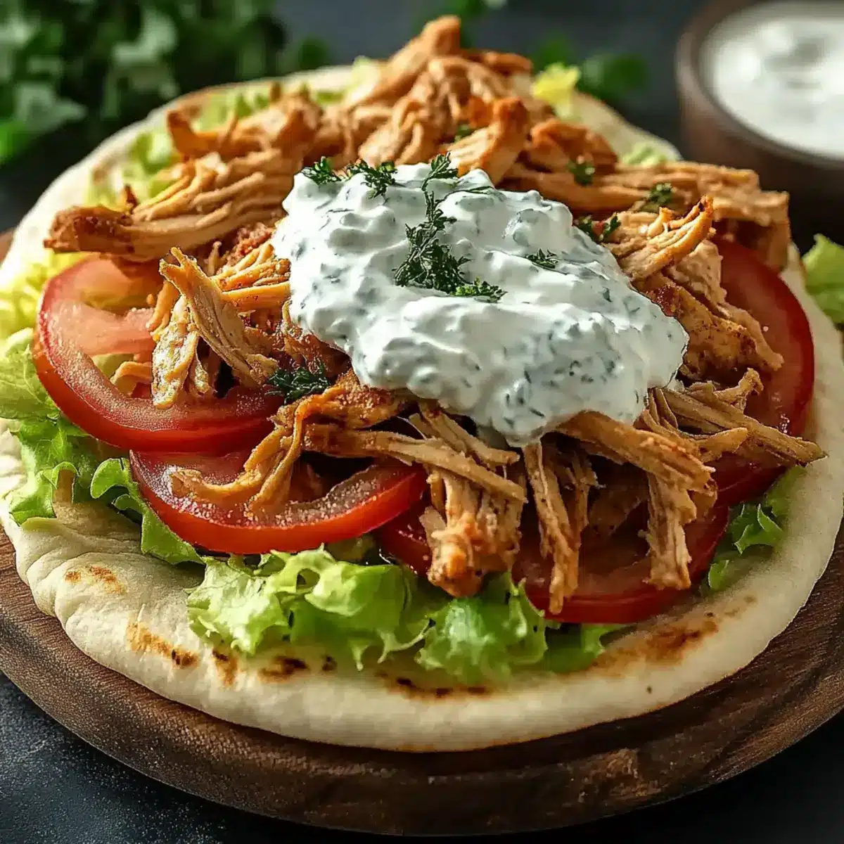 - Serve: Scoop chicken into warm pitas, top with tzatziki and additional toppings.