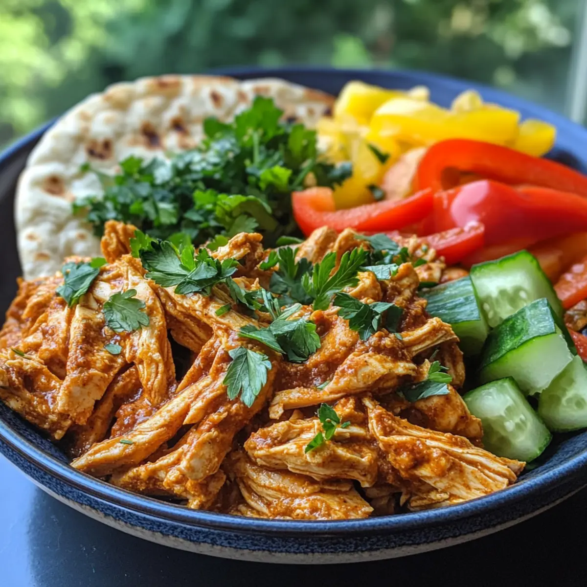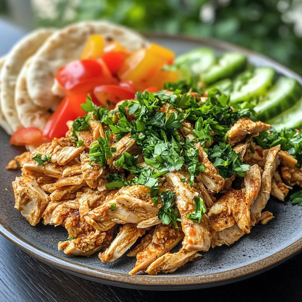 - Serve the shredded chicken in warm pita or over grains, topped with fresh veggies.