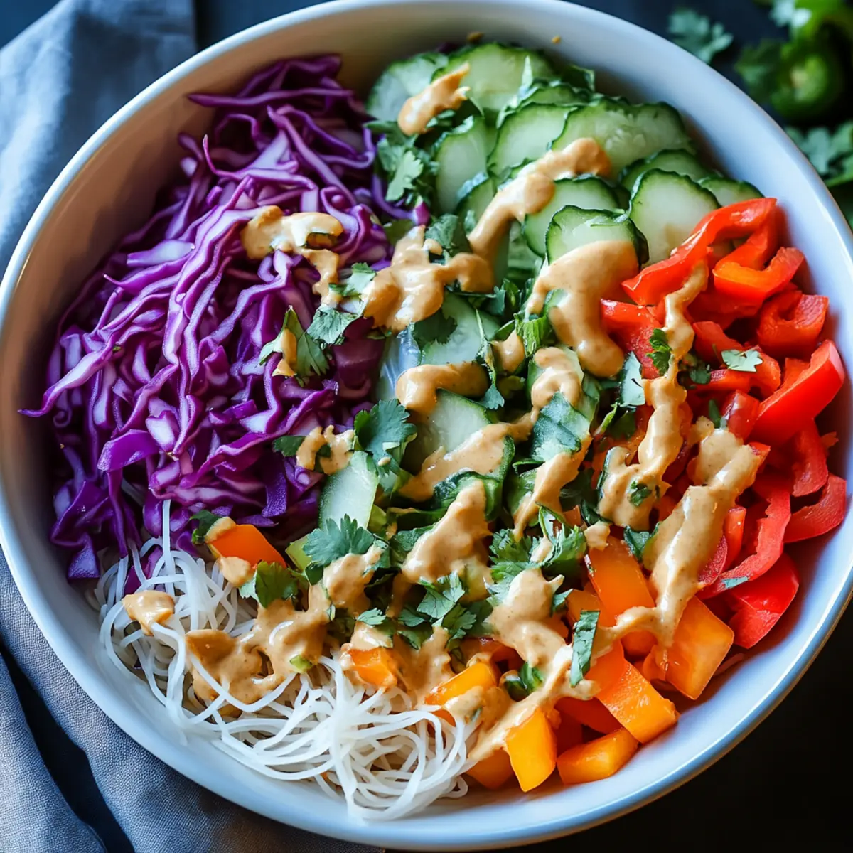 These Spring Roll Salads with Peanut Sauce are perfect for meal prep aficionados! You can prepare the vegetables (cucumber, carrot, purple cabbage, and bell pepper) up to 3 days in advance, storing them in an airtight container in the refrigerator to keep them crisp. The peanut dressing can also be made ahead of time—just keep it refrigerated for up to 1 week. When you’re ready to enjoy your salad, simply cook the rice noodles (which only take minutes), combine everything in a large bowl, and drizzle the dressing over the top. This way, you’ll have a delicious and refreshing meal at your fingertips, just as vibrant and flavorful as if made fresh!