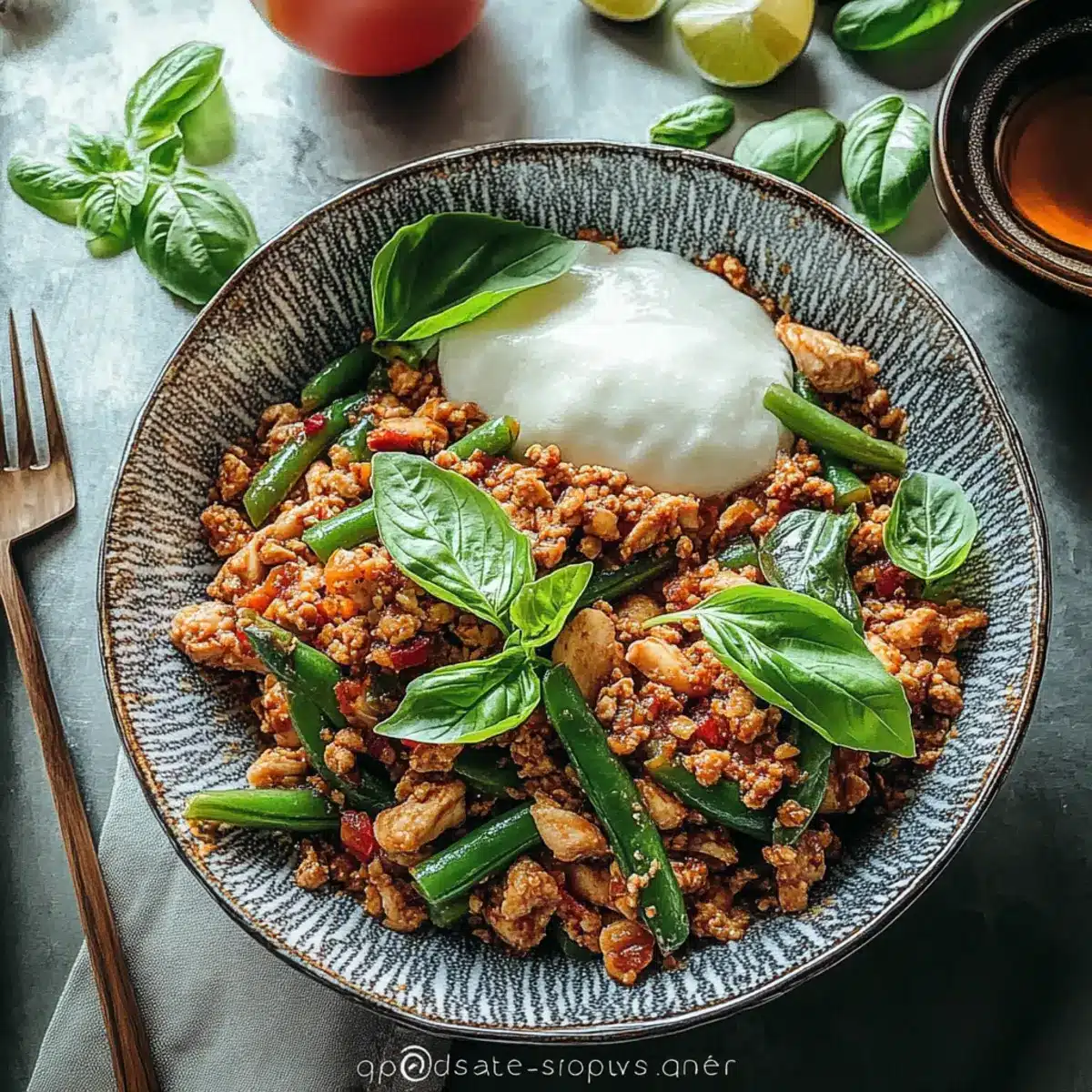 Spoon your Thai Basil Chicken over a bed of steamed rice. For an extra touch of indulgence, top it with a fried egg and serve lime wedges for a zesty kick. Watch as everyone gathers around the table, eager to savor this delightful, homemade Thai meal!